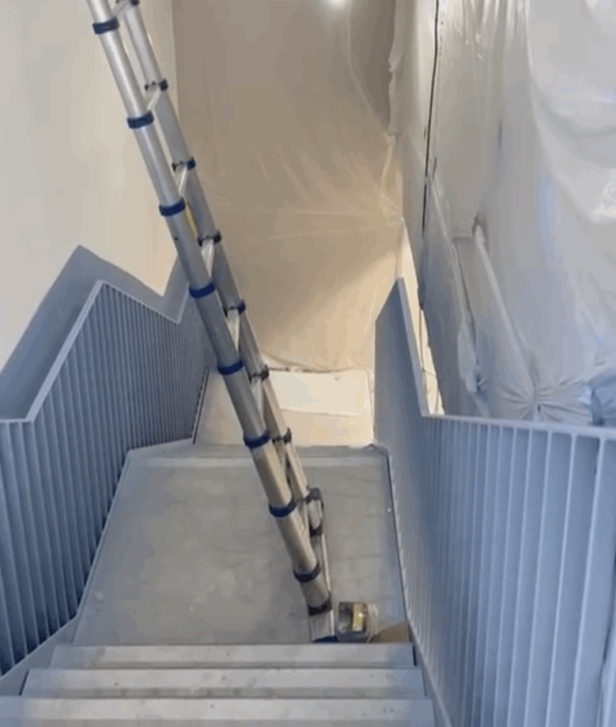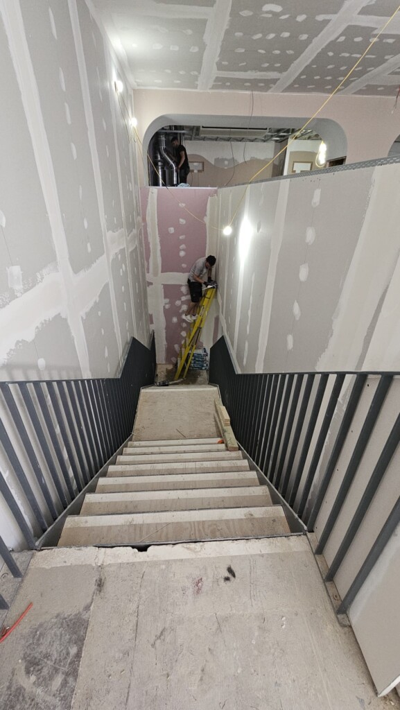 The existing internal staircase was also in need of a refresh and bringing in line with the branding. We prepped and sprayed it in the same branded blue used on the exterior shopfront, creating consistency throughout the entrance area. The finish also provided a more durable and easy-to-clean surface in this high-traffic zone.